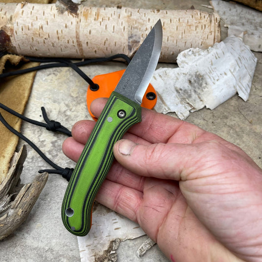 This knife has a textured Green and Black G10, it also has extra thick Hunter Orange G10 liners making a really great feeling chunky han...