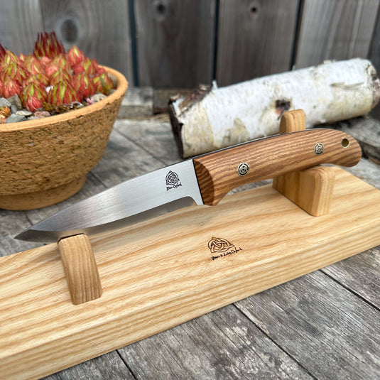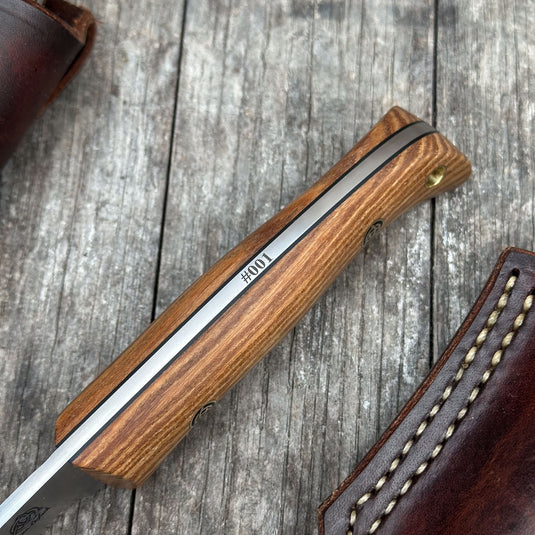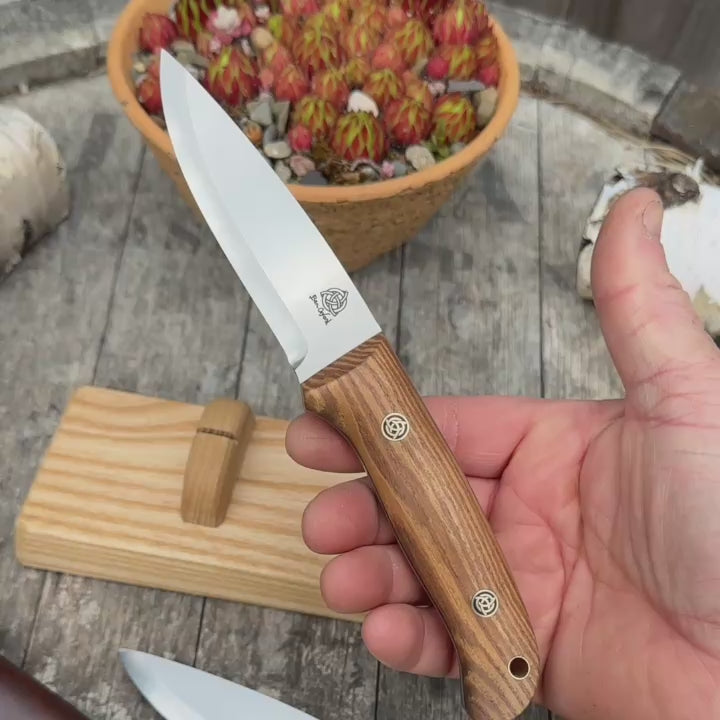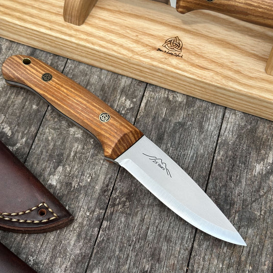 This is our 25th Anniversary Woodlander. Ben journeys back to his roots choosing Olive Ash - a native Herefordshire wood he fell in love with all those years ago - prized for its striking grain, rich tones and rugged durability. A stainless steel AEB-L blade is waterproof; balancing strength, edge retention and sharpening ease. It comes with custom mosaic pins carefully crafted with our logo, a unique number and a handmade Ash display stand. Etched into each blade is our 25th Anniversary mark, a tribute to the Malvern Hills, the ridgeline that has watched over our workshop and shaped our passion for craft since the beginning.