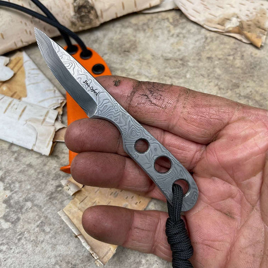 The Thorn is a compact utility and survival blade. The smallest and lightest full tang knife we offer, The Thorn has a 2” cutting edge and a skeletonised handle, a firm favourite for hiking, camping or whenever weight is an issue. A sculpted finger groove and 550 paracord blood knot make for a comfortable contoured fit. Coming with a scandi grind and AEB-L stainless steel as standard, the Thorn makes a perfect companion blade to our larger bushcraft knives or the Orford Parang. The Thorn benefits from our in-house cryogenic heat treatment process to get the best from the steel. Completed with a self locking Hunter Orange Kydex neck sheath, the Thorn XL is an adaptable, multi-purpose EDC.
