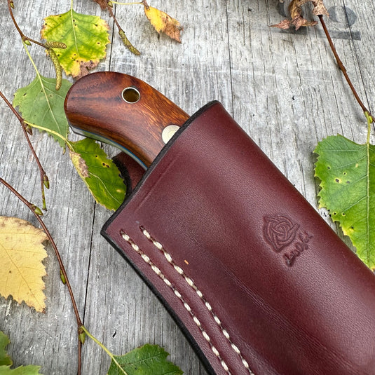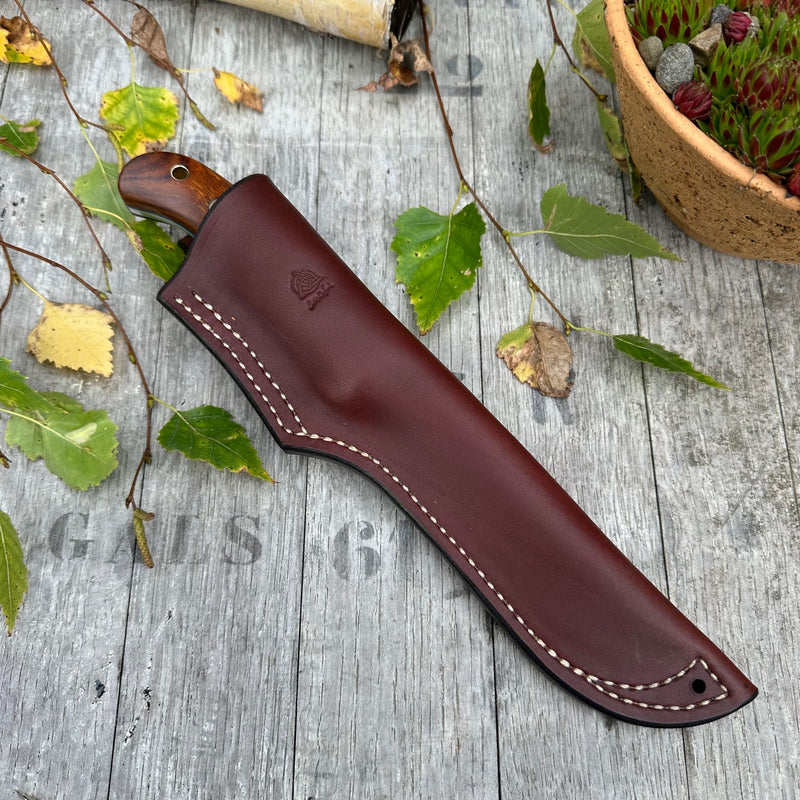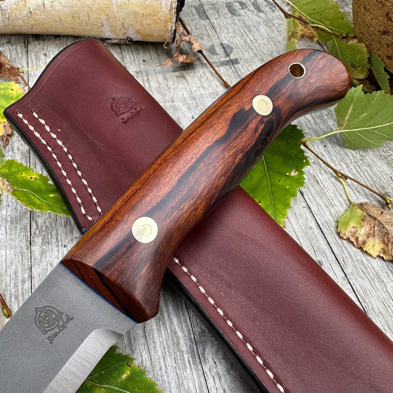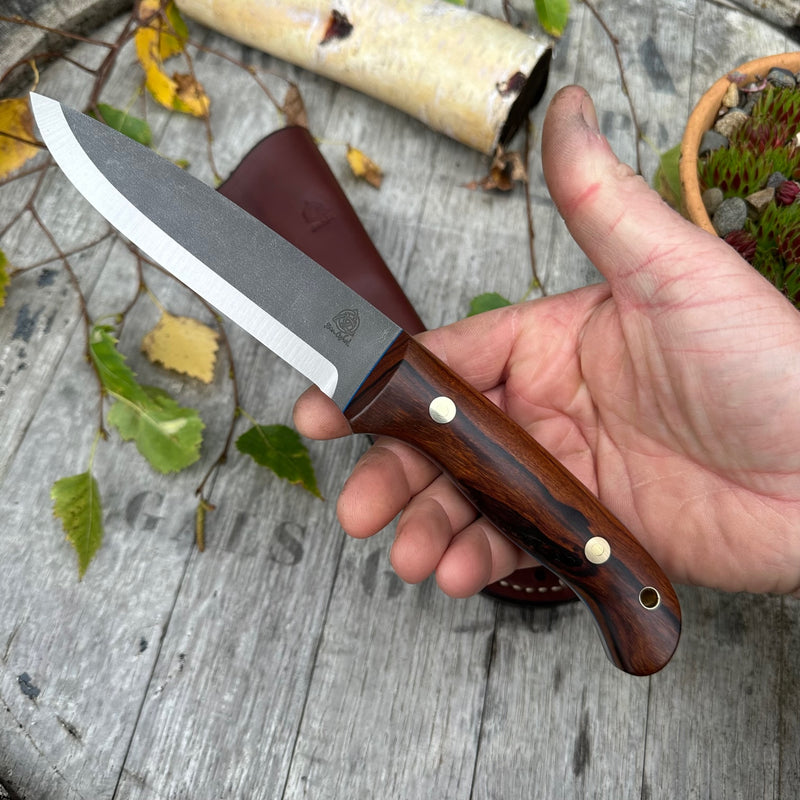 This Woodlander 5" Classic knife is made from 4mm thick stonewashed AEB-L stainless steel. It has a full tang construction for strength. The 4mm makes an incredibly sturdy knife that it well suited for the extreme outdoors enthusiast. The knife design still cuts really well due to the classic "scandi" grind and the blade thickness gives a perfect thickness for heavier work but still has tons of strength needed for more demanding bushcraft chores. The blade shape is suitable for all manner of tasks but can also been used craft work and for chopping due to the longer blade. The handle is made from some lovely Desert Ironwood which is a great handle material and has some thin dark blue liners to offset the handle material. The handle has been heavily shaped and contoured to feel great in the hand. This handle has brass loveless bolts and thong tube for a great looking knife. The combination of the materials used makes a perfect all weather knife that will be able to cope with total immersion in water, so great for canoe bushcraft, food preperation or taking to extreme environments.