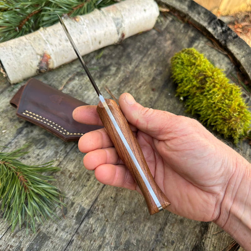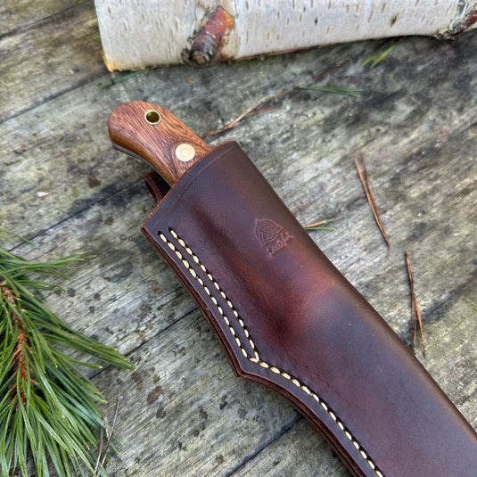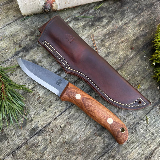 The Elementary Woodlander takes it back to basics. Everything you need from a bushcraft knife and nothing more. The Elementary Woodlander comes with a British Elm handle - our original material on our first bushcraft knives - very stable and split resistant. An 01 tool steel blade with an acid stonewash for an honest finish, easy to sharpen. Brass loveless bolts and thong tube with a full tang construction. All in the locking fit of an Orford Waxed leather belt sheath. The Elementary Woodlander is stripped back to the necessities and built to last a lifetime.