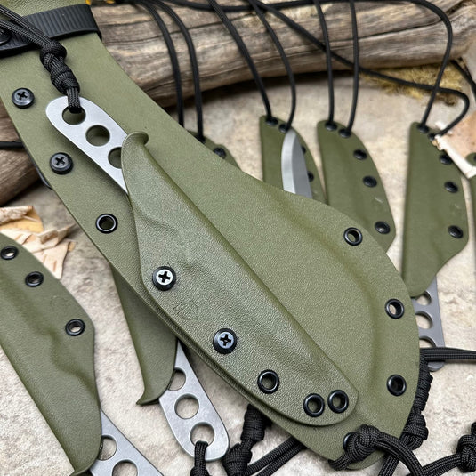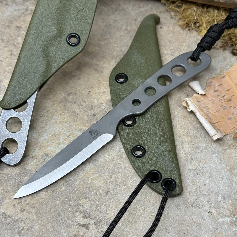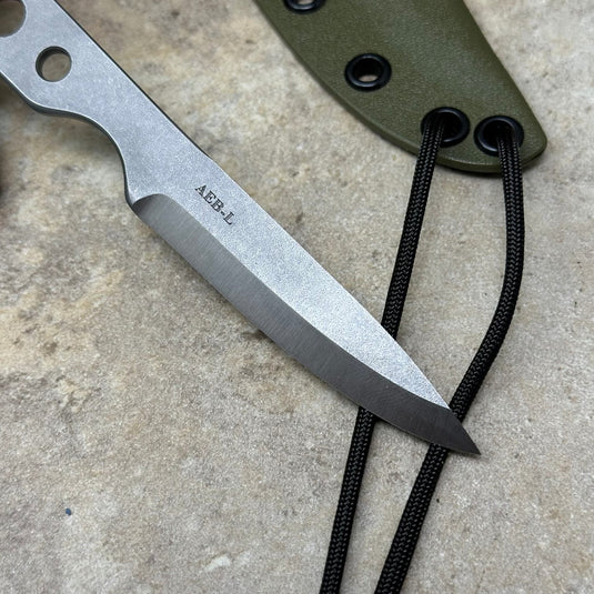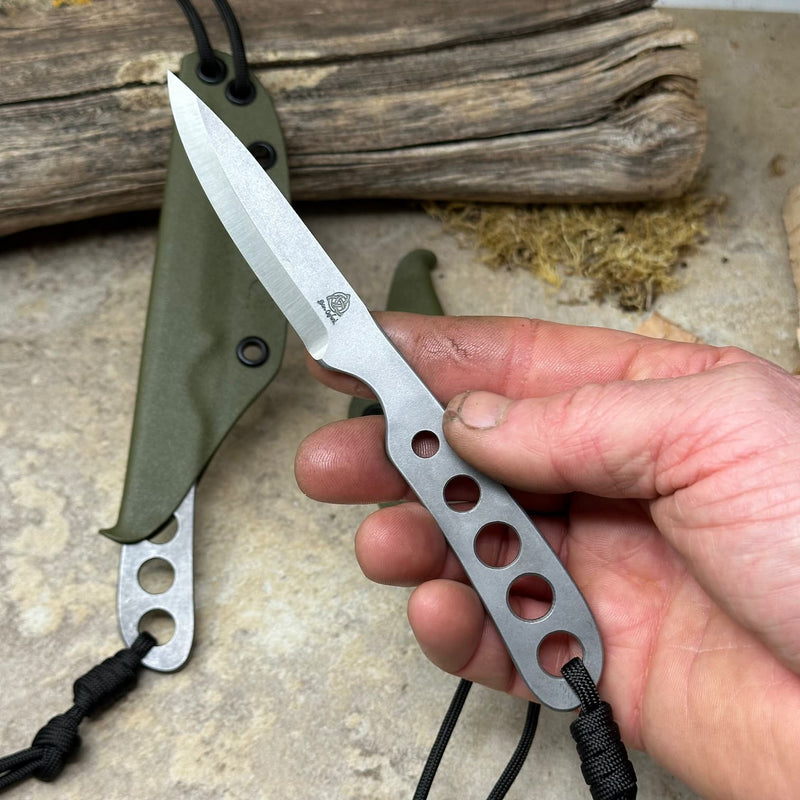 The Thorn XL is a compact utility and survival blade. A super lightweight skeletonised design, the Thorn XL has an extra 1” blade length on the original Thorn, as well as a full size 4” handle for greater reach and control. A sculpted finger groove and 550 paracord blood knot make for a comfortable contoured fit. Coming with a Scandi grind and AEB-L stainless steel as standard, the Thorn XL makes a perfect companion blade to a larger bushcraft knife. The Thorn XL also benefits from our in-house cryogenic heat treatment process to get the best from the steel. Completed with a self locking OD green Kydex neck sheath, the Thorn XL is an adaptable, multi-purpose EDC.