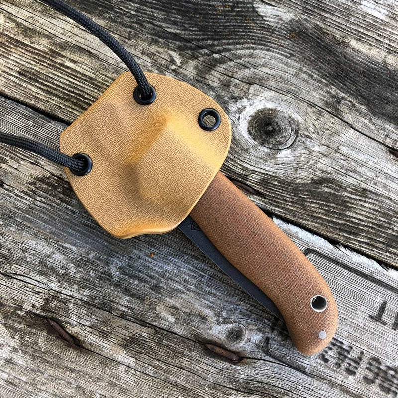 It comes with a Coyote brown kydex neck sheath with a adjustable neck cord made from black 550 Paracord for a great hard use sheath that will lock the knife in place totally securely even in the most extreme use or environment around the globe.