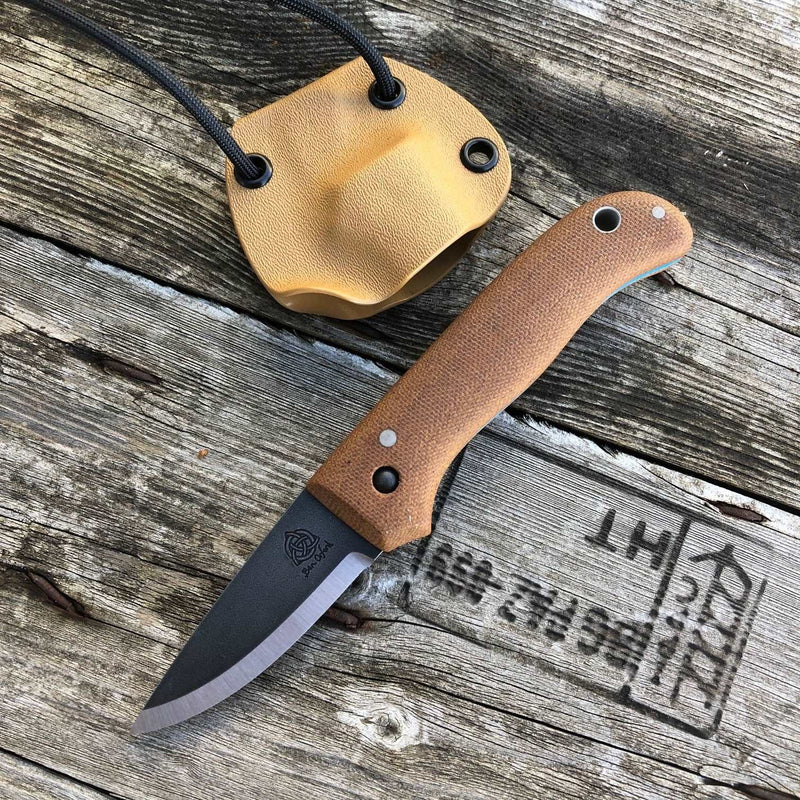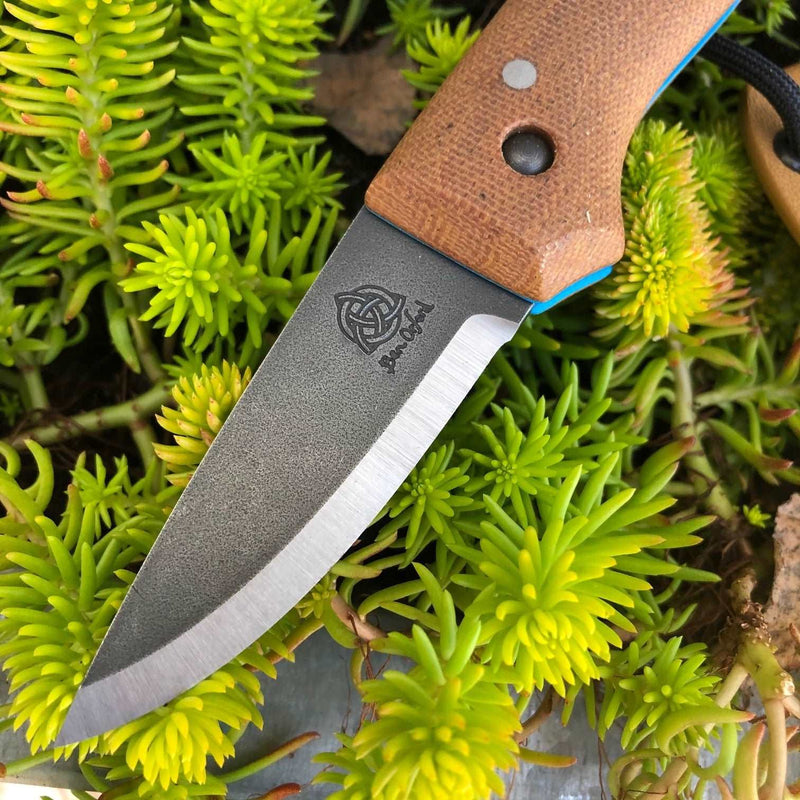 The handle is made from Natural canvas micarta with signature Blue G10 liners and back spacer. it has stainless fittings for a clean look and great strength. It has been shaped, contoured and blasted to give a great grippy feel in the hand and give a positive grip even in wet or cold conditions. This micarta handle will be a great choice for the adventurer or bushcrafter who needs a hard use knife which will not let you down regardless of the environment you are in or, if you want a wet weather knife, a canoe bushcraft knife or to use it a lot for food preparation, then this is a great Nomad for your next adventure.
