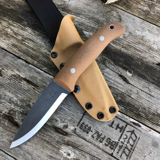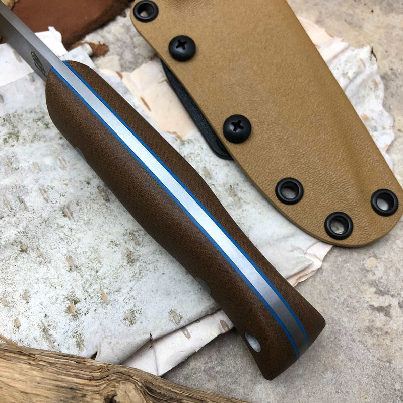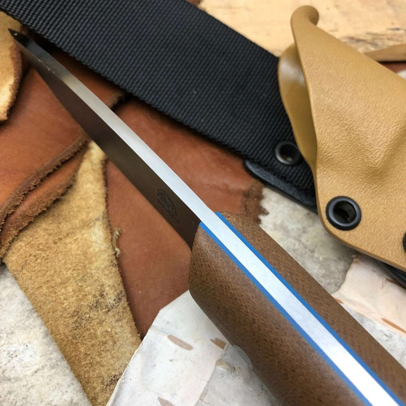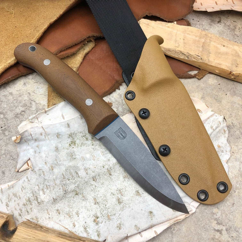 It comes with a Coyote brown kydex belt sheath with a soft loop belt system to make a great hard use sheath that will lock the knife in place totally securely even in the most extreme use or environment around the globe.